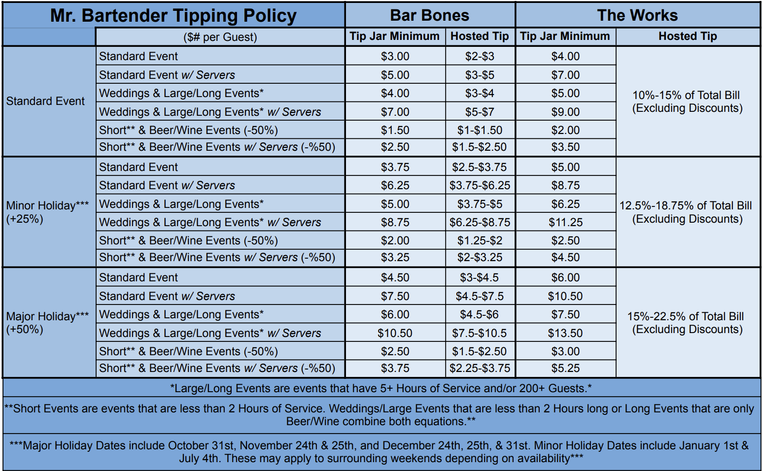 All Staffing, Bar Rental, & Package rates may be subject to higher rates on Major Holidays & Minor Holidays, and/or the weekends surrounding them.